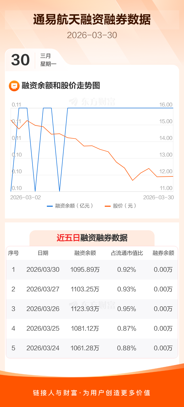交易所最新数据显示,通易航天于2026年3月30日获融资买入1.18万元,融资偿还8.54万元,当日融资净偿还7.35万元。目前,该股融资余额1095.89万,占流通市值比例为0.92%。