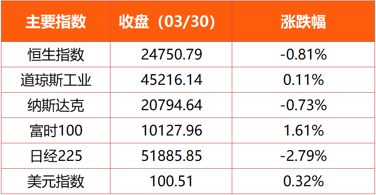 美股市场:截止3月30日收盘,美股三大指数涨跌不一。有分析指出,由于美国总统特朗普对伊朗发出新的警告且中东冲突进一步升级,抵消了鲍威尔“鸽派”表态及美伊谈判相关进展所带来的提振。