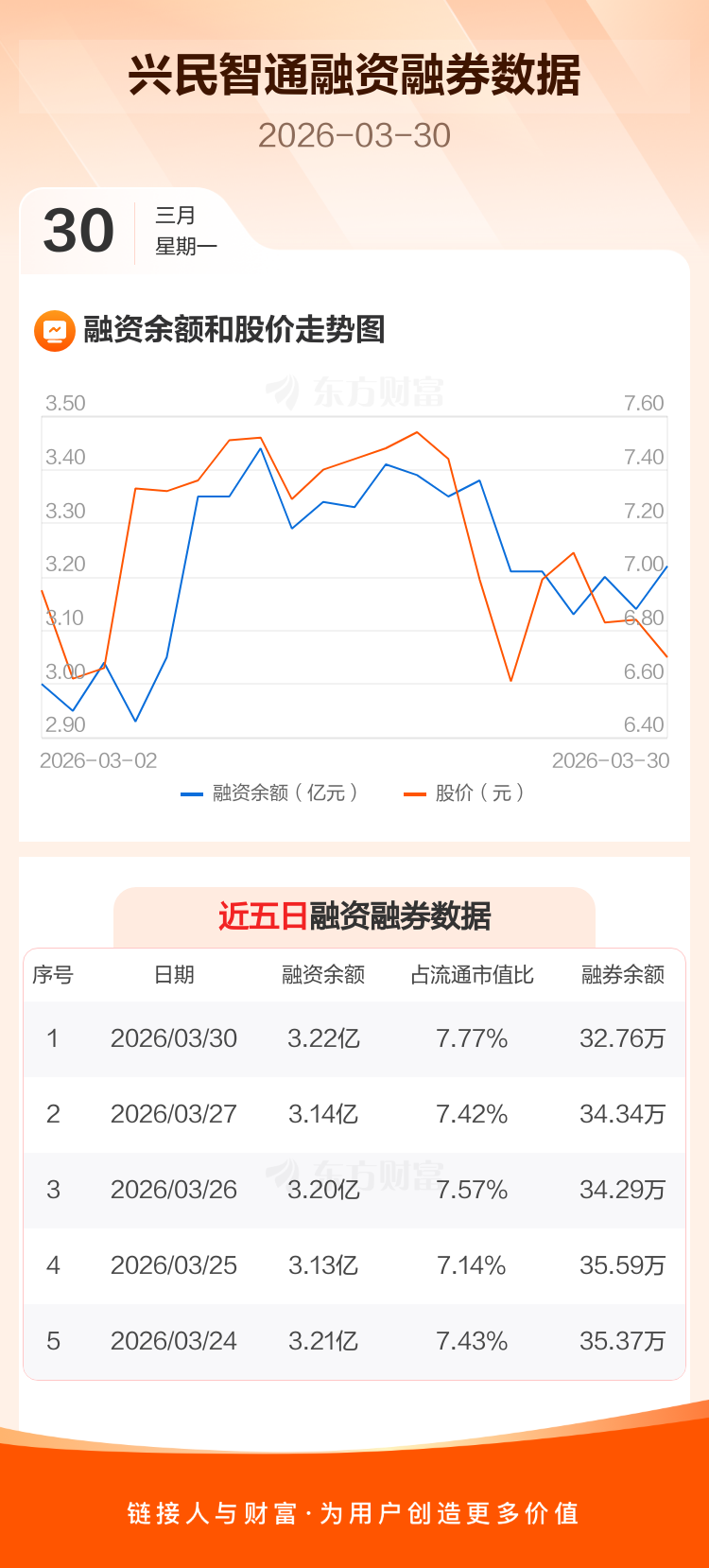 交易所最新数据显示,兴民智通于2026年3月30日获融资买入2350.62万元,融资偿还1555.86万元,当日融资净买入794.77万元。目前,该股融资余额3.22亿,占流通市值比例为7.77%。