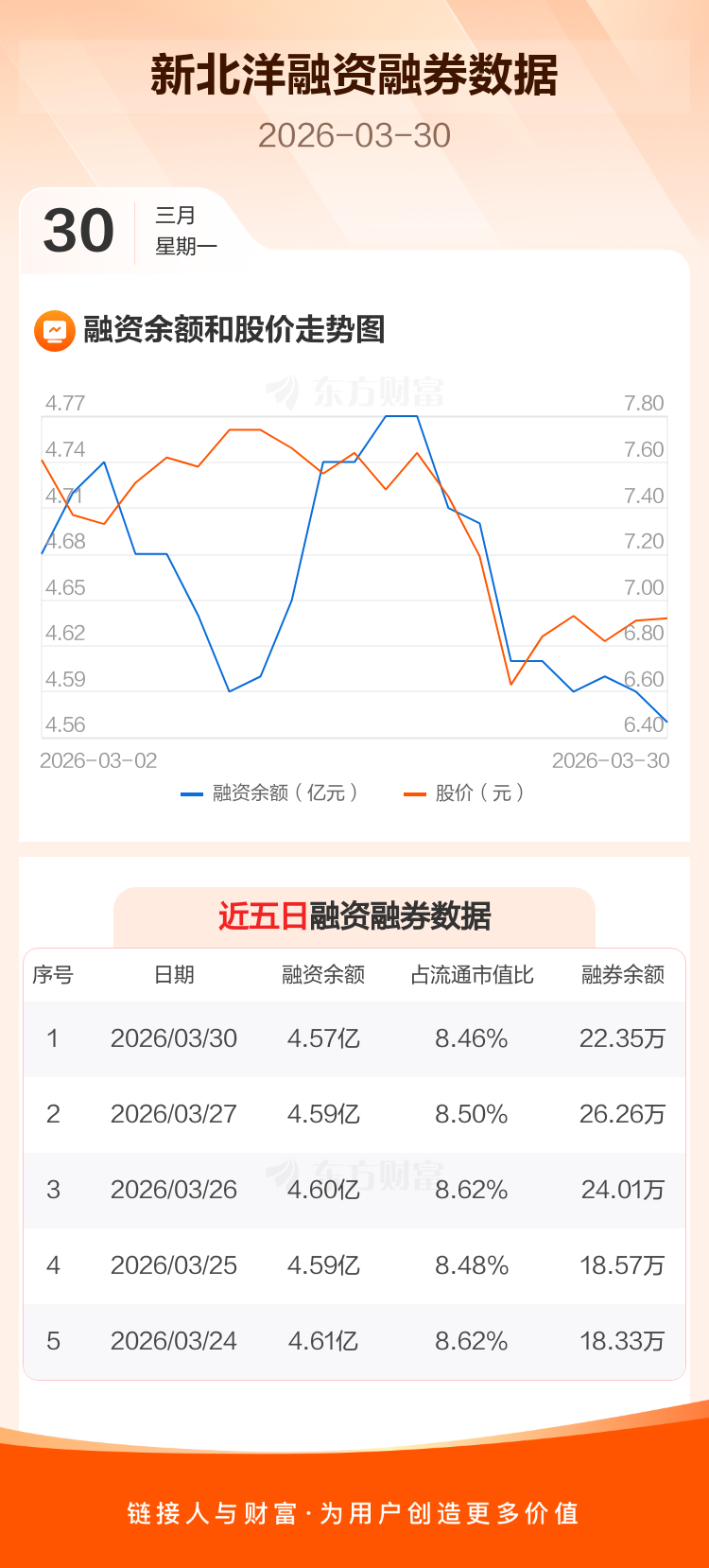 交易所最新数据显示,新北洋于2026年3月30日获融资买入430.80万元,融资偿还582.07万元,当日融资净偿还151.28万元。目前,该股融资余额4.57亿,占流通市值比例为8.46%。