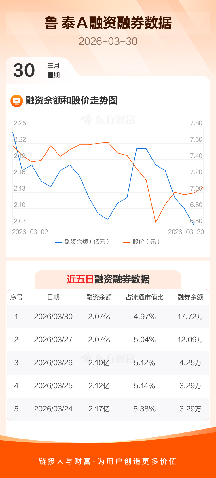 交易所最新数据显示,鲁 泰A于2026年3月30日获融资买入512.35万元,融资偿还568.28万元,当日融资净偿还55.93万元。目前,该股融资余额2.07亿,占流通市值比例为4.97%。