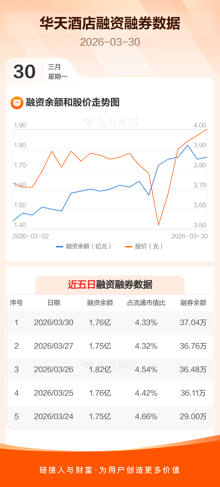 交易所最新数据显示,华天酒店于2026年3月30日获融资买入715.22万元,融资偿还547.33万元,当日融资净买入167.89万元。目前,该股融资余额1.76亿,占流通市值比例为4.33%。