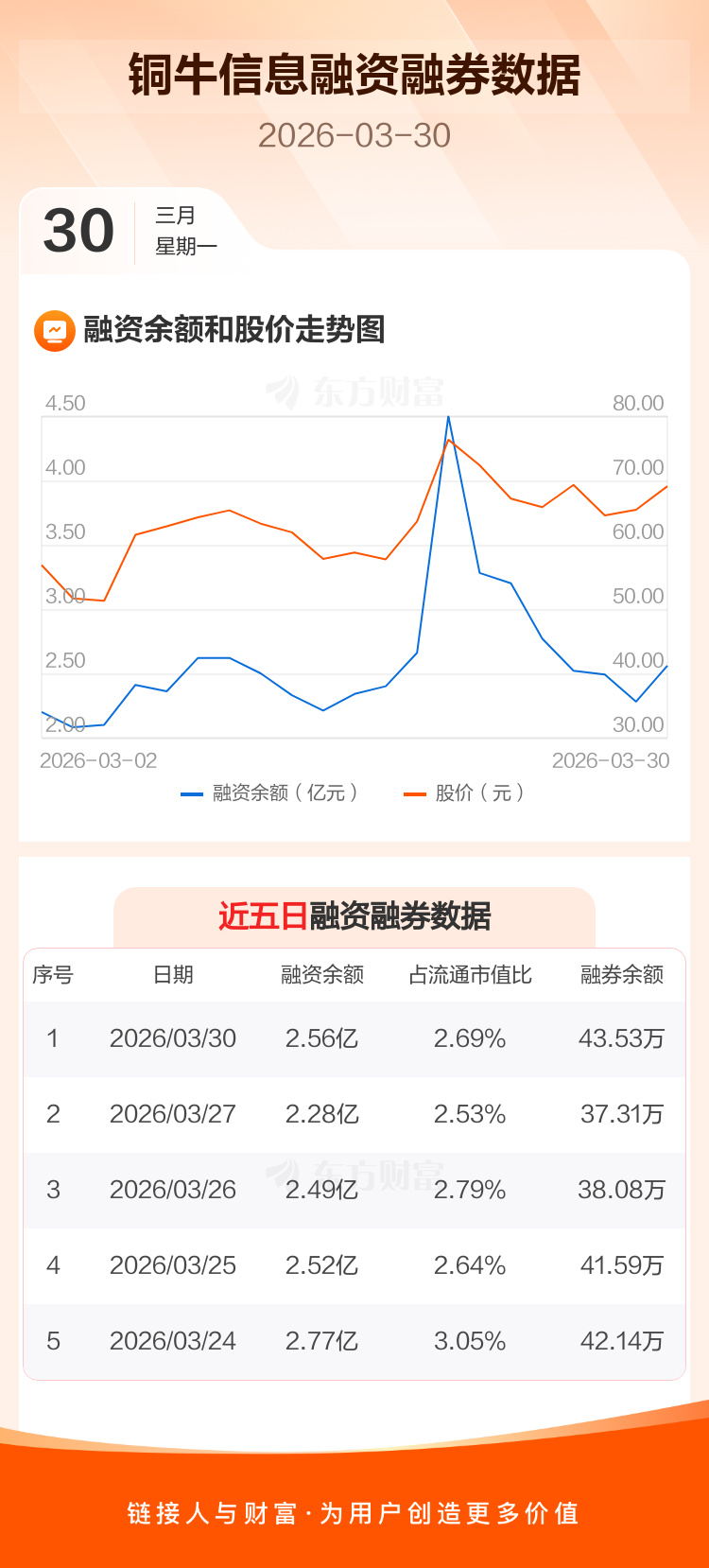 交易所最新数据显示,铜牛信息于2026年3月30日获融资买入1.39亿元,融资偿还1.11亿元,当日融资净买入2803.66万元。目前,该股融资余额2.56亿,占流通市值比例为2.69%。