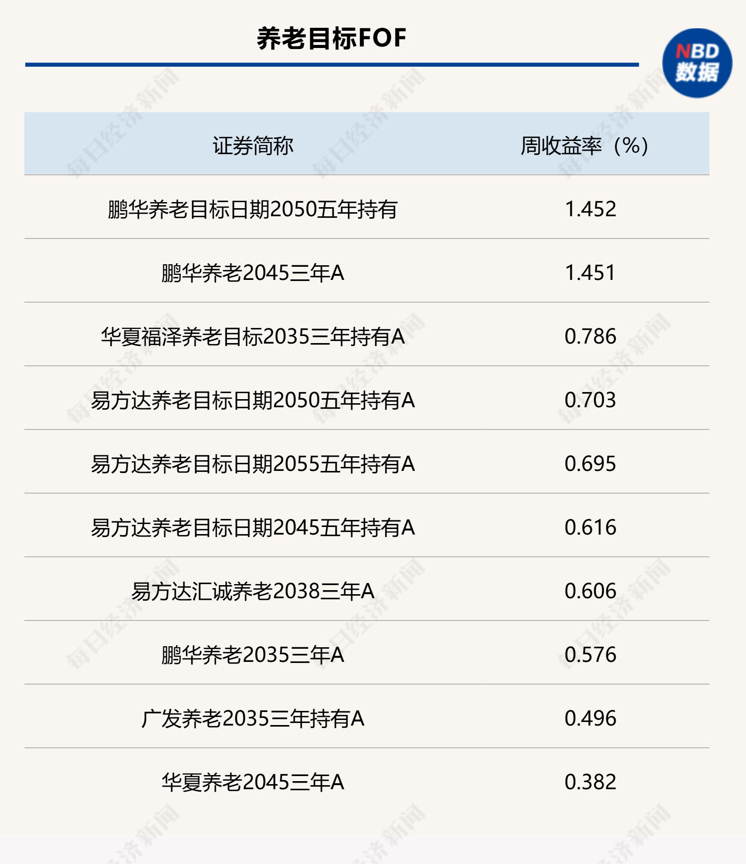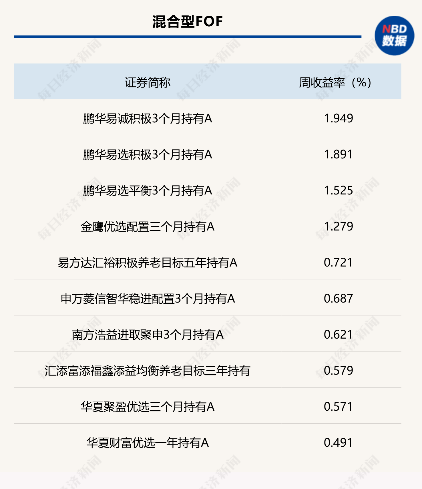表现较好的板块集中在有色金属、公用事业、基础化工等板块。这也使得配置相关资产的FOF在上周有不错的业绩表现。Wind统计显示,混合型FOF和养老目标FOF的头部业绩均在1%以上,其中不少产品重仓有色金属、基础化工相关板块。