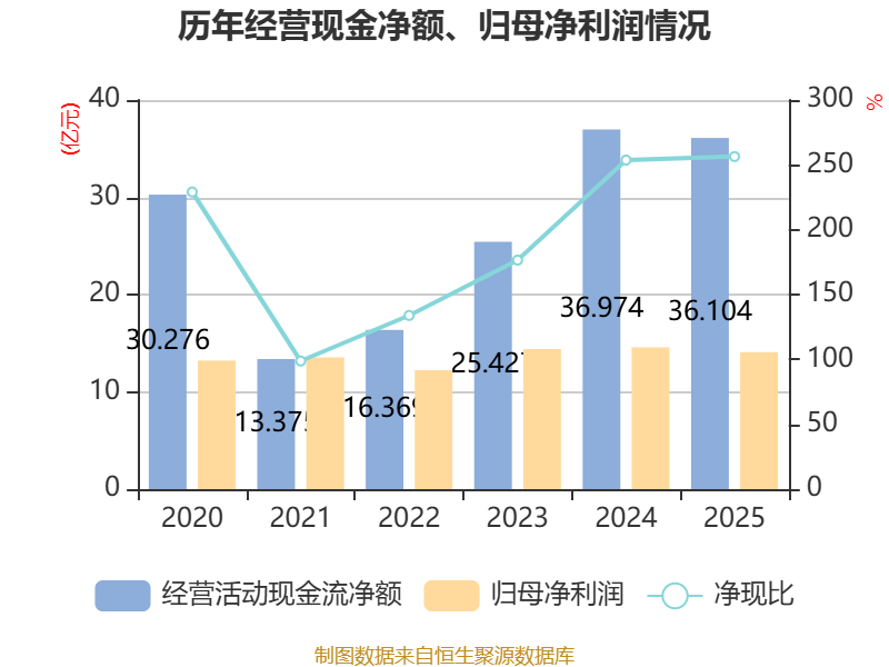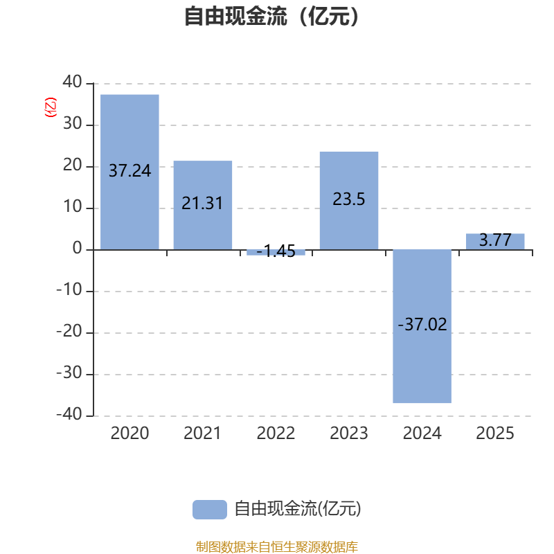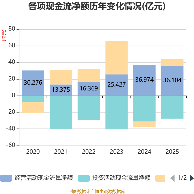 截至2025年,公司经营活动现金流净额为36.1亿元,同比下降2.35%;筹资活动现金流净额7.95亿元,同比增加15.05亿元;投资活动现金流净额-27.63亿元,上年同期为-31.07亿元。