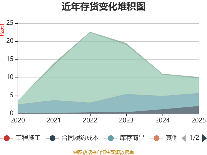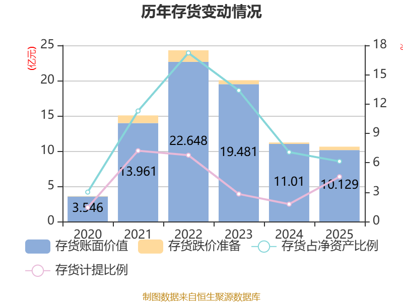 从存货变动来看,截至2025年末,公司存货账面价值为10.13亿元,占净资产的6.14%,较上年末减少8807.59万元。其中,存货跌价准备为4845.66万元,计提比例为4.57%。