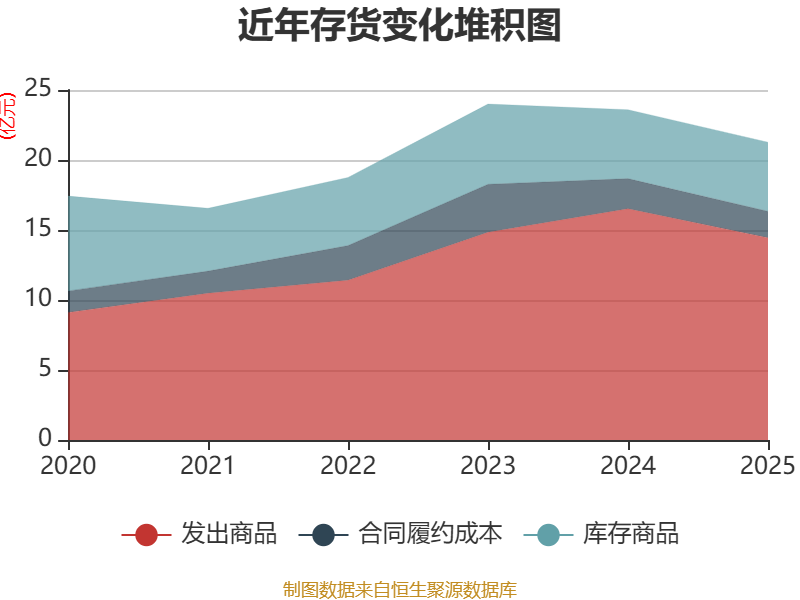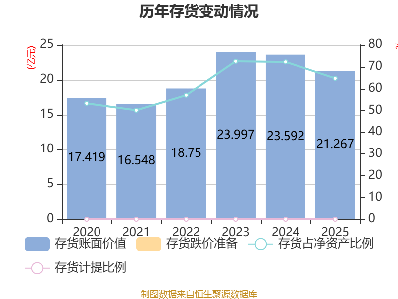 从存货变动来看,截至2025年末,公司存货账面价值为21.27亿元,占净资产的64.65%,较上年末减少2.33亿元。公司本期没有计提存货跌价准备。