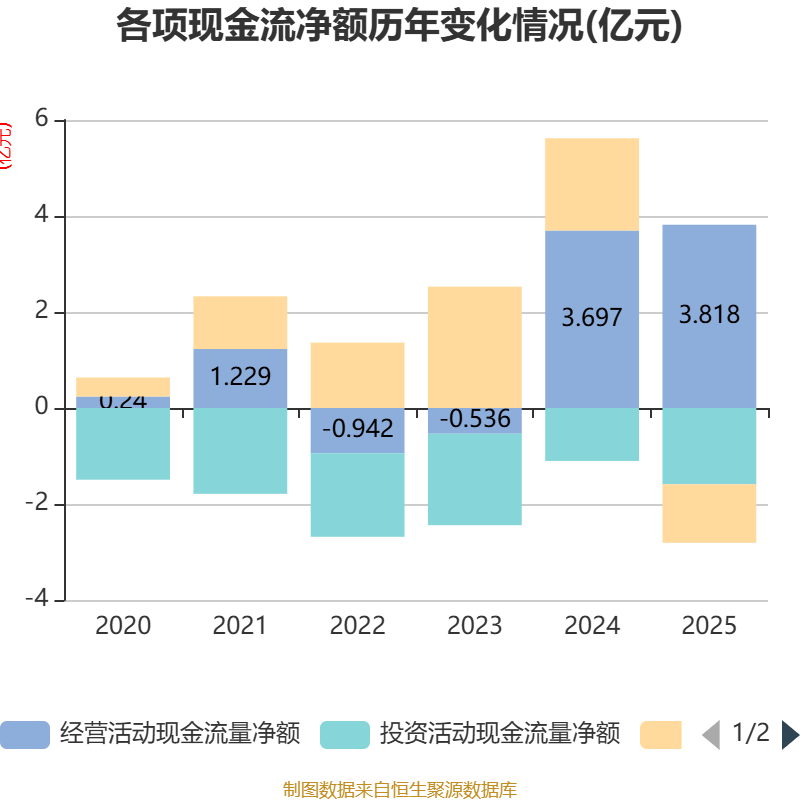 截至2025年,公司经营活动现金流净额为3.82亿元,同比增长3.27%;筹资活动现金流净额-1.22亿元,同比减少3.14亿元;投资活动现金流净额-1.59亿元,上年同期为-1.1亿元。