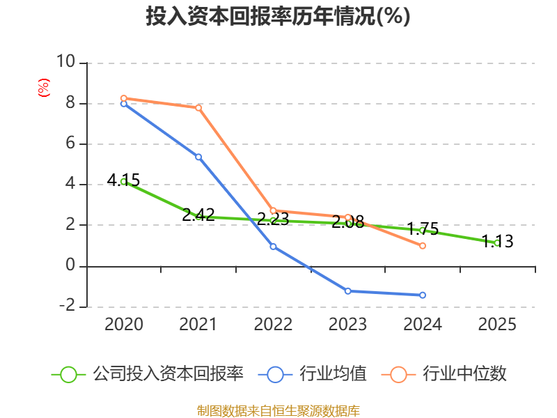 数据显示,2025年公司加权平均净资产收益率为0.94%,较上年同期上升0.24个百分点。公司2025年投入资本回报率为1.13%,较上年同期下降0.62个百分点。