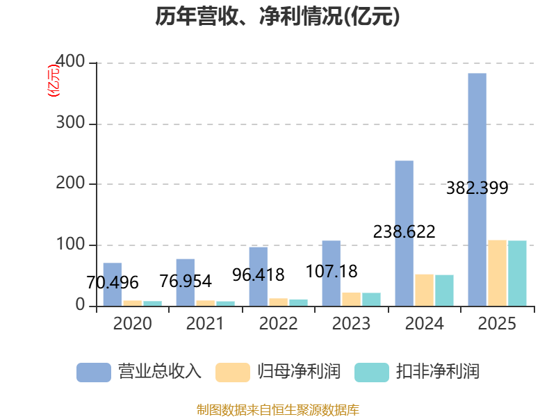 中证智能财讯中际旭创(300308)3月31日披露2025年年度报告。2025年,公司实现营业总收入382.4亿元,同比增长60.25%;归母净利润107.97亿元,同比增长108.78%;扣非净利润107.1亿元,同比增长111.31%;经营活动产生的现金流量净额为108.96亿元,同比增长244.31%;报告期内,中际旭创基本每股收益为9.8元,加权平均净资产收益率为43.84%。公司2025年度分配预案为:拟向全体股东每10股派现10元(含税)。
