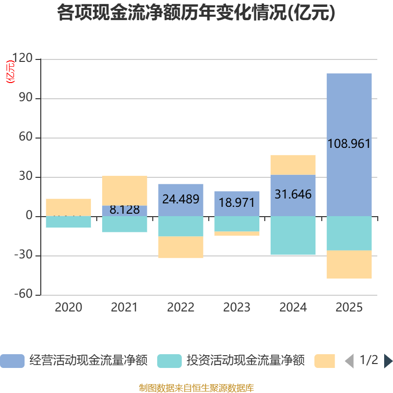 截至2025年,公司经营活动现金流净额为108.96亿元,同比增长244.31%;筹资活动现金流净额-21.44亿元,同比减少36.36亿元;投资活动现金流净额-26.19亿元,上年同期为-29.42亿元。