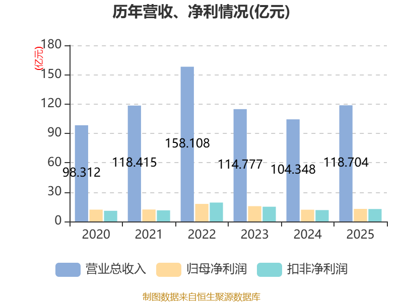 中证智能财讯扬农化工(600486)3月31日披露2025年年度报告。2025年,公司实现营业总收入118.7亿元,同比增长13.76%;归母净利润12.86亿元,同比增长6.98%;扣非净利润12.72亿元,同比增长9.39%;经营活动产生的现金流量净额为22.17亿元,同比增长2.85%;报告期内,扬农化工基本每股收益为3.188元,加权平均净资产收益率为11.69%。公司2025年度分配预案为:拟向全体股东每10股派现7.14元(含税)。