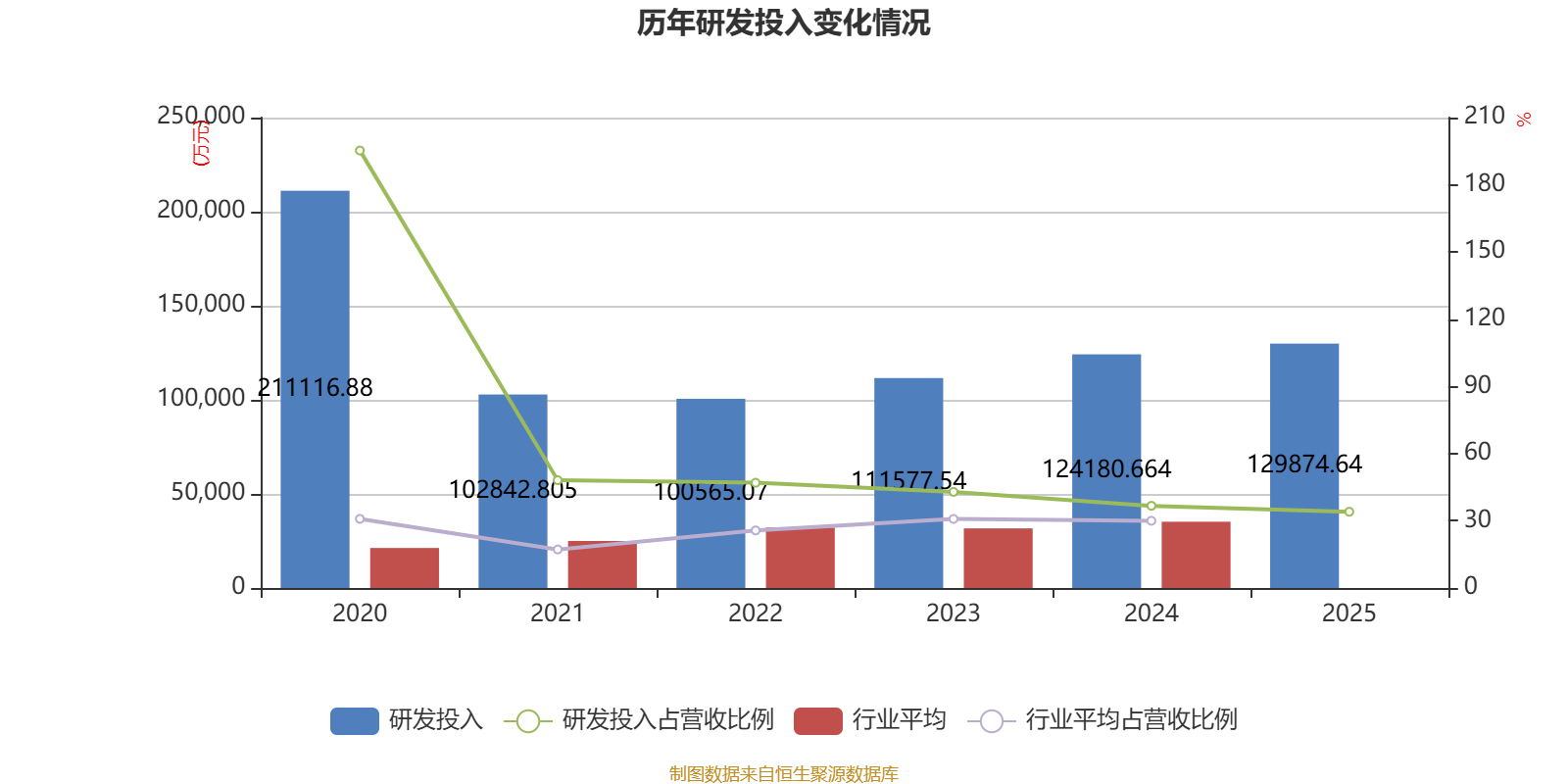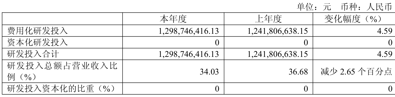 2025年全年,公司研发投入金额为12.99亿元,同比增长4.59%;研发投入占营业收入比例为34.03%,相比上年同期下降2.65个百分点。此外,公司全年研发投入资本化率为0%。