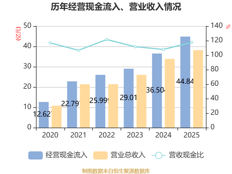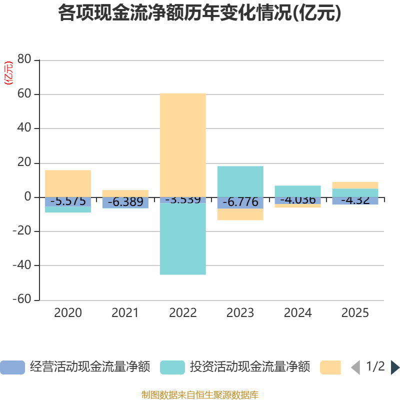 截至2025年,公司经营活动现金流净额为-4.32亿元,同比减少2842.64万元;筹资活动现金流净额3.86亿元,同比增加5.94亿元;投资活动现金流净额4.98亿元,上年同期为6.7亿元。