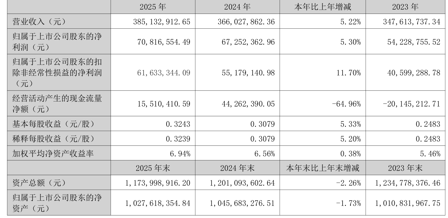 中证智能财讯雷尔伟(301016)3月31日披露2025年年度报告。2025年,公司实现营业总收入3.85亿元,同比增长5.22%;归母净利润7081.66万元,同比增长5.30%;扣非净利润6163.33万元,同比增长11.70%;经营活动产生的现金流量净额为1551.04万元,同比下降64.96%;报告期内,雷尔伟基本每股收益为0.3243元,加权平均净资产收益率为6.94%。公司2025年度分配预案为:拟向全体股东每10股转4股,派现1.5元(含税)。