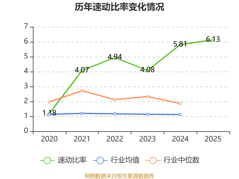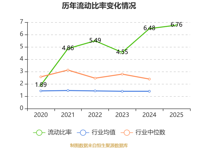 2025年,公司流动比率为6.76,速动比率为6.13。