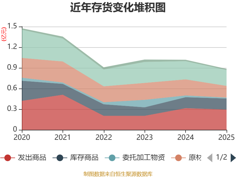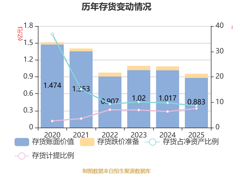 从存货变动来看,截至2025年末,公司存货账面价值为8833.23万元,占净资产的8.6%,较上年末减少1340.19万元。其中,存货跌价准备为719.9万元,计提比例为7.54%。