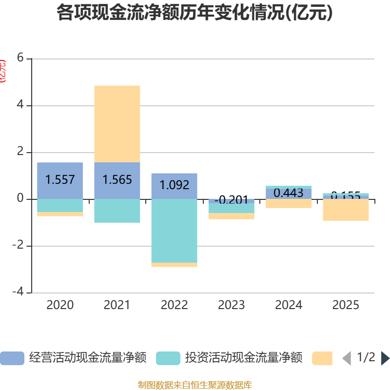 截至2025年,公司经营活动现金流净额为1551.04万元,同比下降64.96%;筹资活动现金流净额-9360万元,同比减少5450万元;投资活动现金流净额882.4万元,上年同期为1168.75万元。