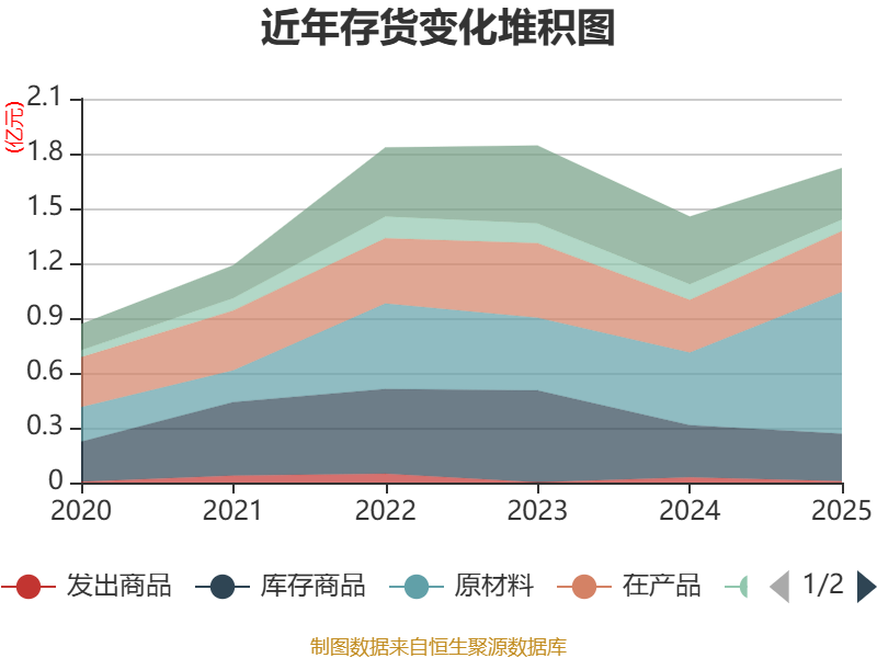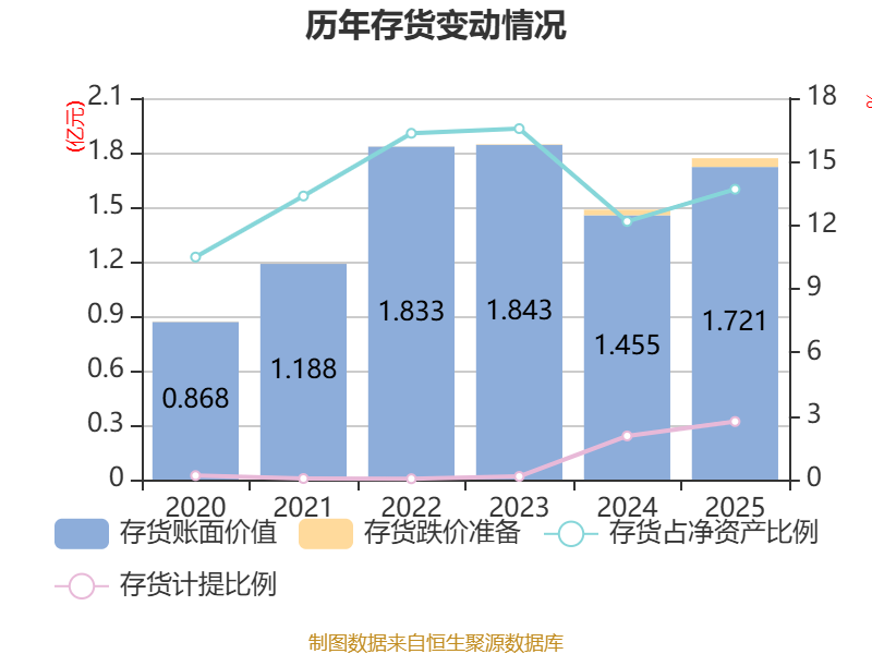 从存货变动来看,截至2025年末,公司存货账面价值为1.72亿元,占净资产的13.7%,较上年末增加2663.61万元。其中,存货跌价准备为484.35万元,计提比例为2.74%。