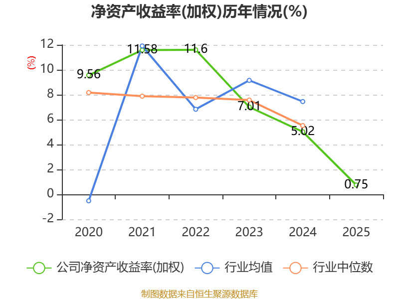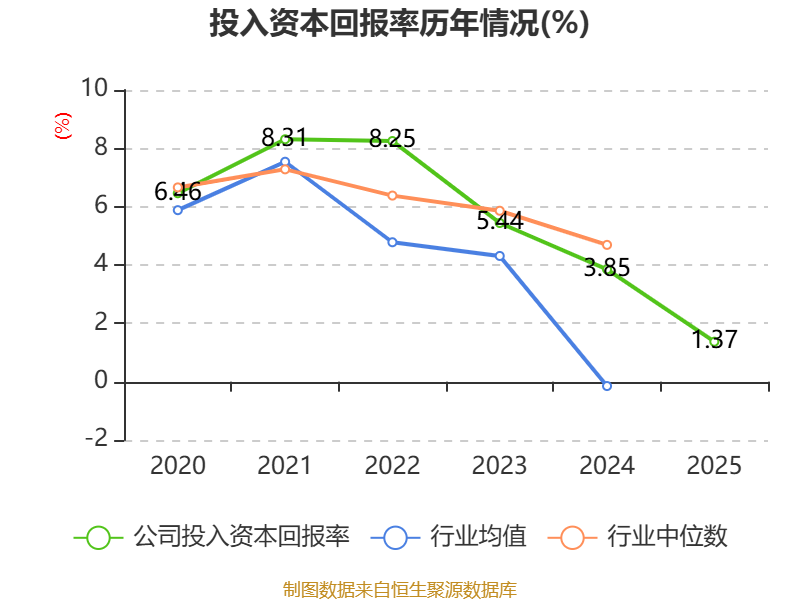 数据显示,2025年公司加权平均净资产收益率为0.75%,较上年同期下降4.27个百分点。公司2025年投入资本回报率为1.37%,较上年同期下降2.48个百分点。