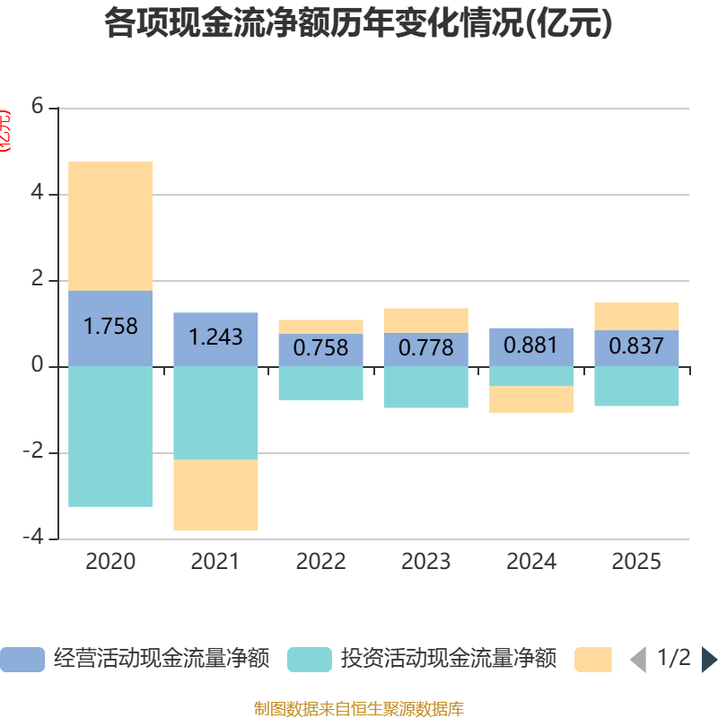 截至2025年,公司经营活动现金流净额为8373.47万元,同比下降4.99%;筹资活动现金流净额6425.25万元,同比增加1.26亿元;投资活动现金流净额-9243.21万元,上年同期为-4637.23万元。