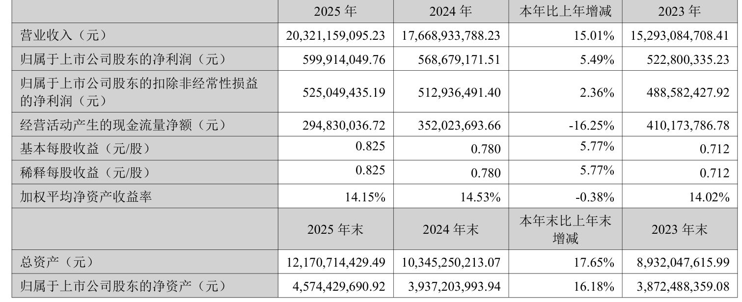 中证智能财讯金杯电工(002533)3月31日披露2025年年度报告。2025年,公司实现营业总收入203.21亿元,同比增长15.01%;归母净利润6亿元,同比增长5.49%;扣非净利润5.25亿元,同比增长2.36%;经营活动产生的现金流量净额为2.95亿元,同比下降16.25%;报告期内,金杯电工基本每股收益为0.825元,加权平均净资产收益率为14.15%。公司2025年度分配预案为:拟向全体股东每10股派现4.5元(含税)。