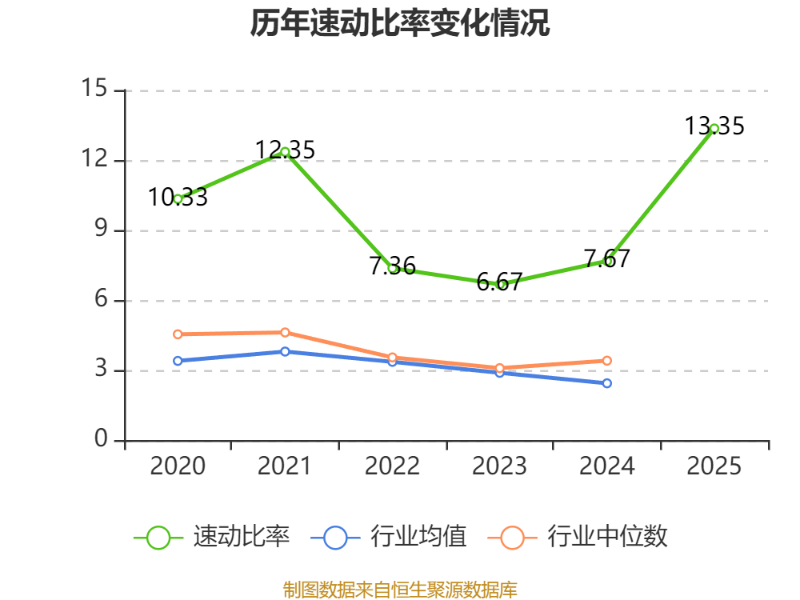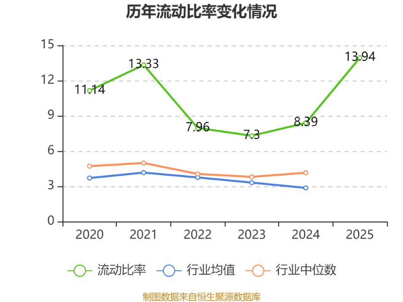 2025年,公司流动比率为13.94,速动比率为13.35。