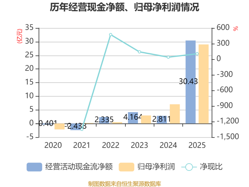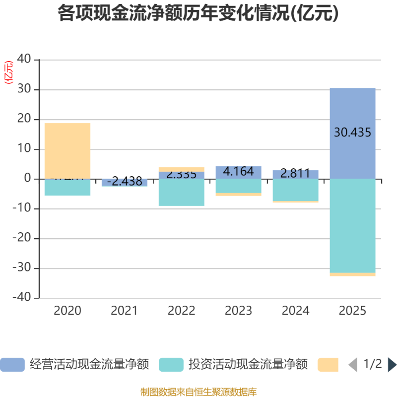 截至2025年,公司经营活动现金流净额为30.43亿元,同比增长982.56%;筹资活动现金流净额-1.11亿元,同比减少5869.47万元;投资活动现金流净额-31.64亿元,上年同期为-7.5亿元。