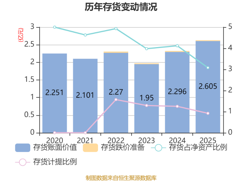 从存货变动来看,截至2025年末,公司存货账面价值为2.61亿元,占净资产的3.08%,较上年末增加3094.89万元。其中,存货跌价准备为241.94万元,计提比例为0.92%。