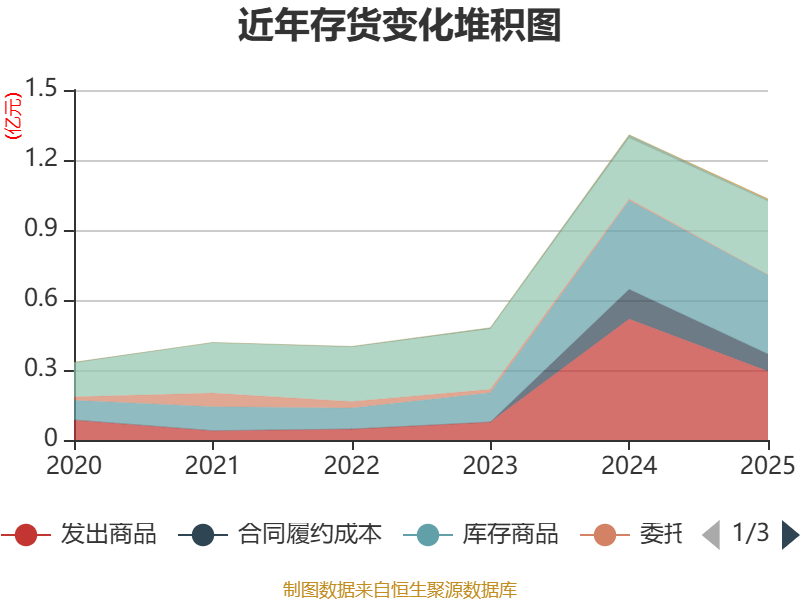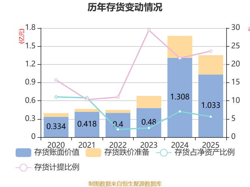 从存货变动来看,截至2025年末,公司存货账面价值为1.03亿元,占净资产的5.63%,较上年末减少2749.41万元。其中,存货跌价准备为3199.7万元,计提比例为23.66%。