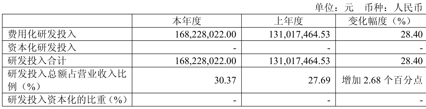 2025年全年,公司研发投入金额为1.68亿元,同比增长28.4%;研发投入占营业收入比例为30.37%,相比上年同期上升2.68个百分点。