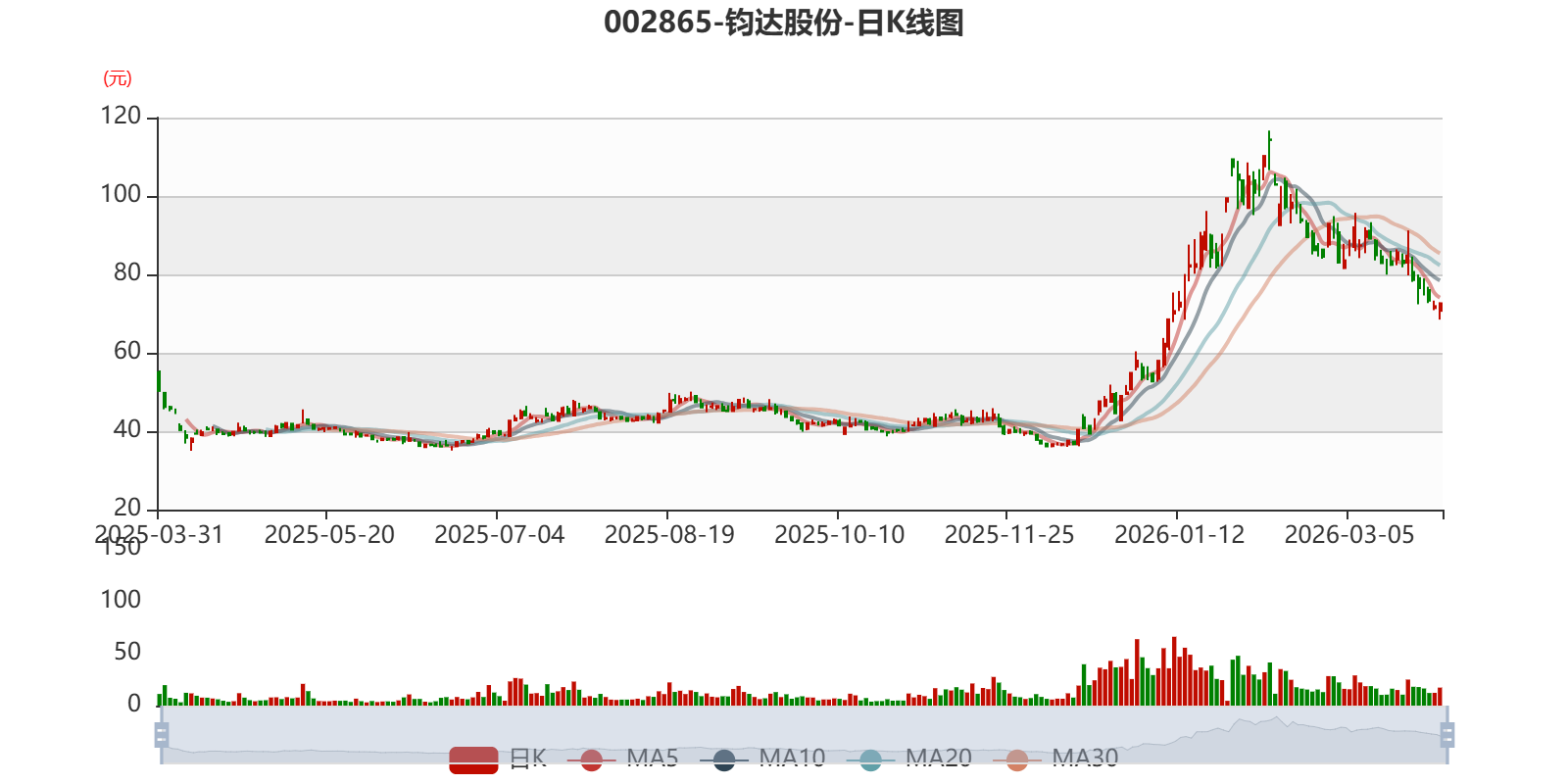 以3月30日收盘价计算,钧达股份目前市盈率(TTM)约为-15.96倍,市净率(LF)约6.18倍,市销率(TTM)约2.96倍。