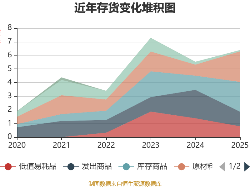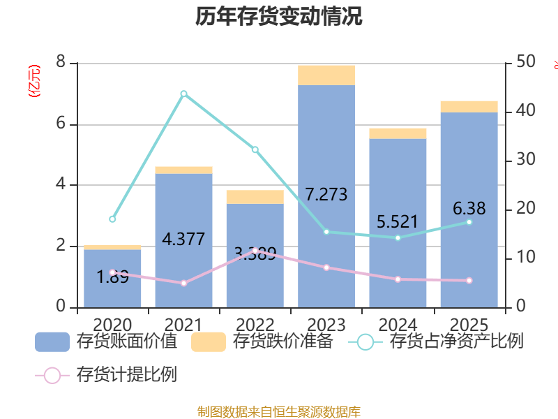 从存货变动来看,截至2025年末,公司存货账面价值为6.38亿元,占净资产的17.43%,较上年末增加8590.55万元。其中,存货跌价准备为3689.54万元,计提比例为5.47%。