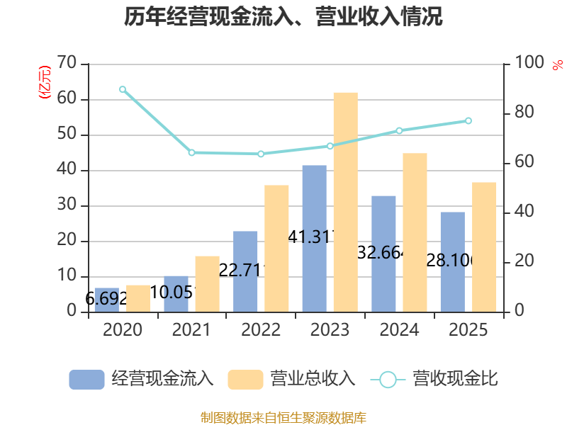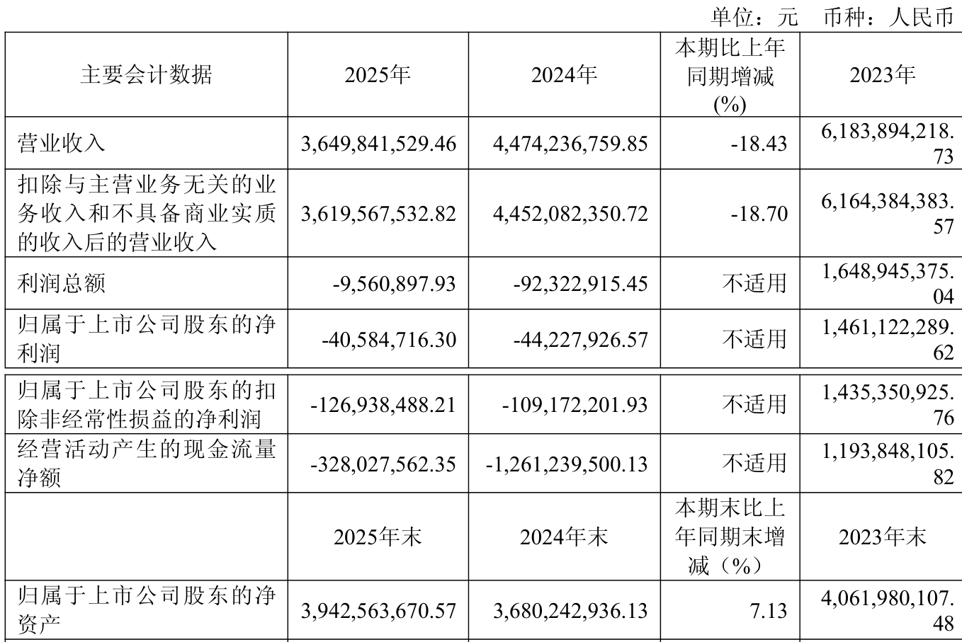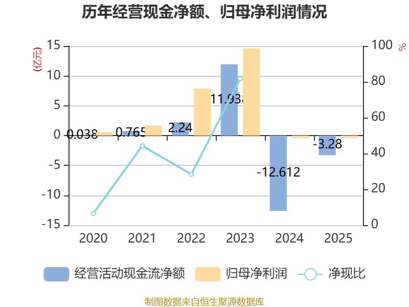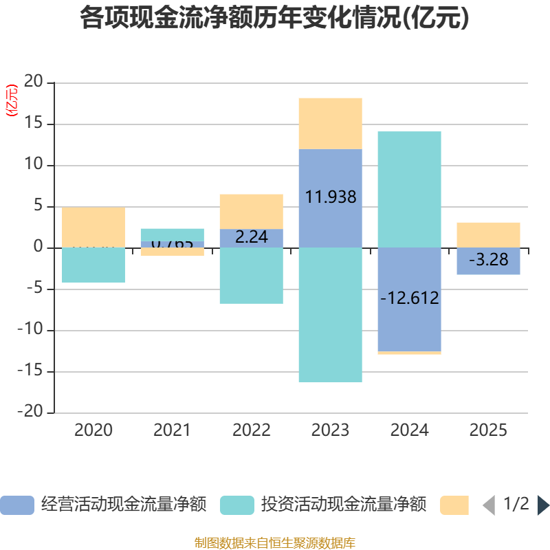 截至2025年,公司经营活动现金流净额为-3.28亿元,同比增加9.33亿元;筹资活动现金流净额3.01亿元,同比增加3.37亿元;投资活动现金流净额-181.83万元,上年同期为14.08亿元。