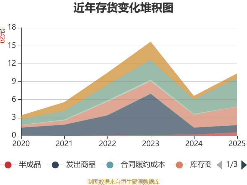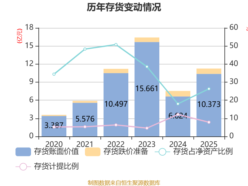 从存货变动来看,截至2025年末,公司存货账面价值为10.37亿元,占净资产的26.31%,较上年末增加3.75亿元。其中,存货跌价准备为8820.88万元,计提比例为7.84%。
