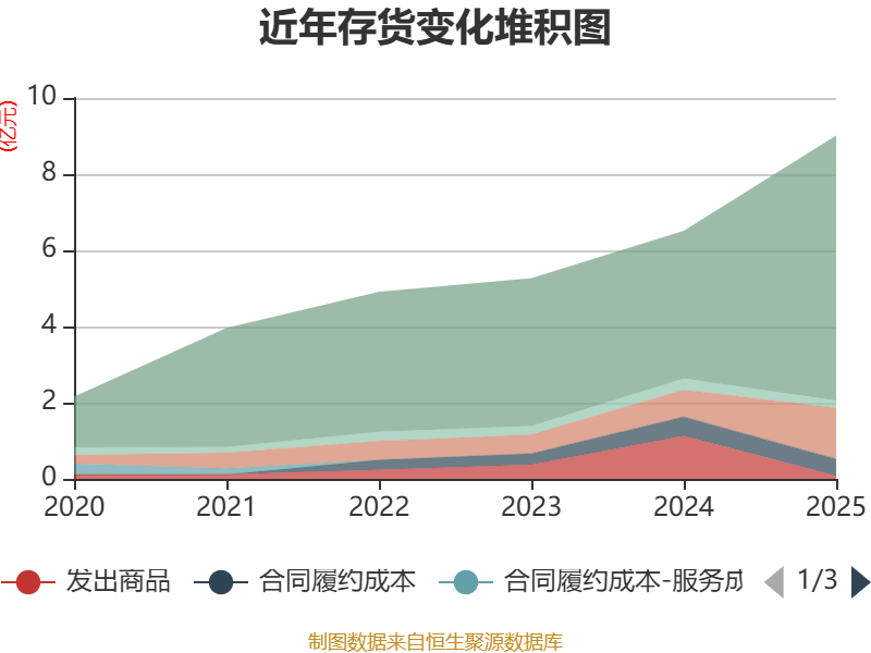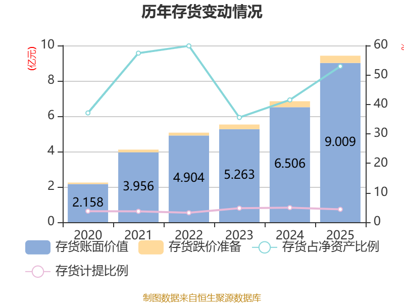 从存货变动来看,截至2025年末,公司存货账面价值为9.01亿元,占净资产的52.92%,较上年末增加2.5亿元。其中,存货跌价准备为4107.72万元,计提比例为4.36%。