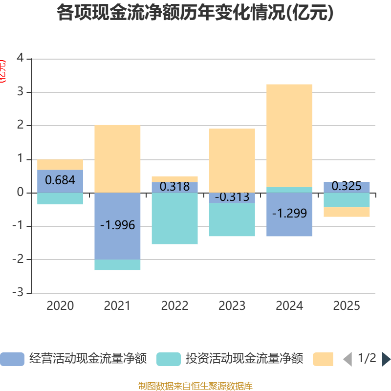 截至2025年,公司经营活动现金流净额为3249.49万元,同比增加1.62亿元;筹资活动现金流净额-2838.02万元,同比减少3.35亿元;投资活动现金流净额-4353.92万元,上年同期为1675.86万元。