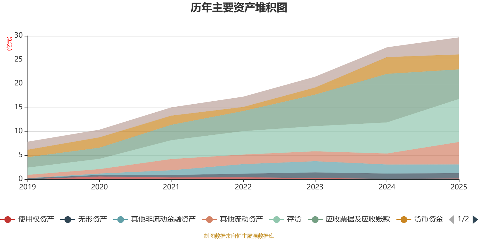资产重大变化方面,截至2025年末,公司应收票据及应收账款较上年末减少39.04%,占公司总资产比重下降15.94个百分点;其他流动资产较上年末增加104.54%,占公司总资产比重上升7.5个百分点;存货较上年末增加38.48%,占公司总资产比重上升6.79个百分点;预付款项较上年末增加479.71%,占公司总资产比重上升2.82个百分点。