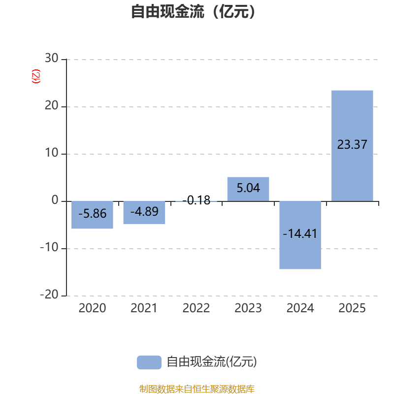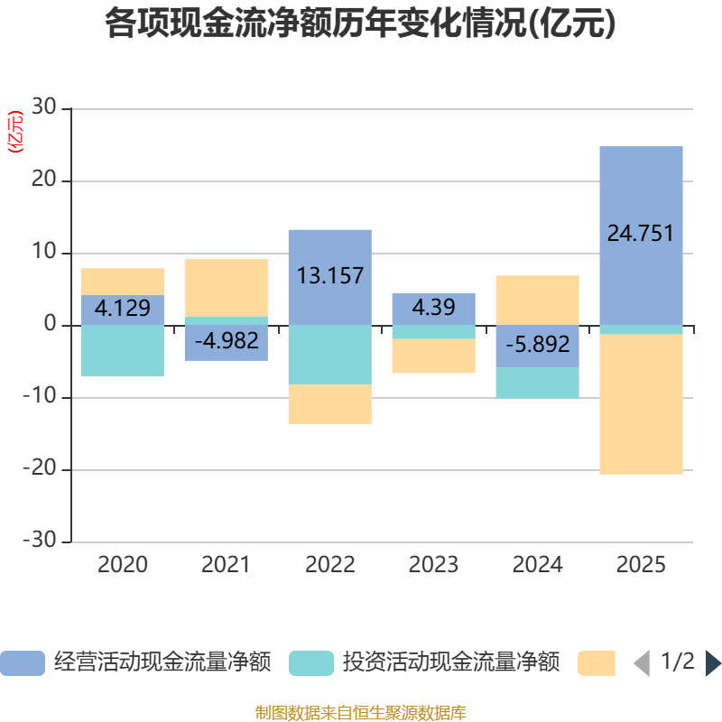 截至2025年,公司经营活动现金流净额为24.75亿元,同比增加30.64亿元;筹资活动现金流净额-19.39亿元,同比减少26.23亿元;投资活动现金流净额-1.33亿元,上年同期为-4.3亿元。