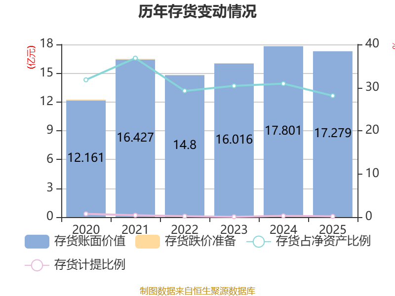 从存货变动来看,截至2025年末,公司存货账面价值为17.28亿元,占净资产的28.1%,较上年末减少5216.64万元。其中,存货跌价准备为274.55万元,计提比例为0.16%。