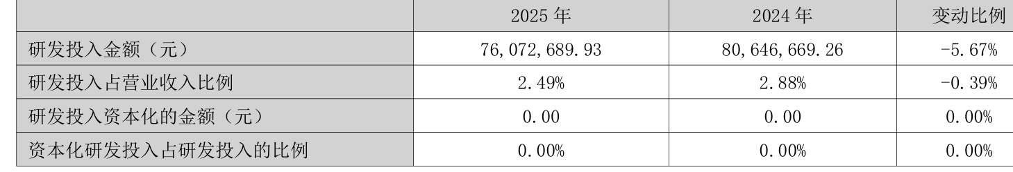 2025年全年,公司研发投入金额为7607.27万元,同比下降5.67%;研发投入占营业收入比例为2.49%,相比上年同期下降0.39个百分点。此外,公司全年研发投入资本化率为0%。