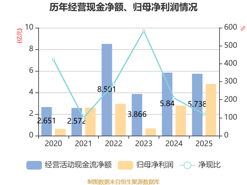 截至2025年,公司经营活动现金流净额为5.74亿元,同比下降1.74%;筹资活动现金流净额-1731.26万元,同比增加4.99亿元;投资活动现金流净额-10.45亿元,上年同期为-5.49亿元。