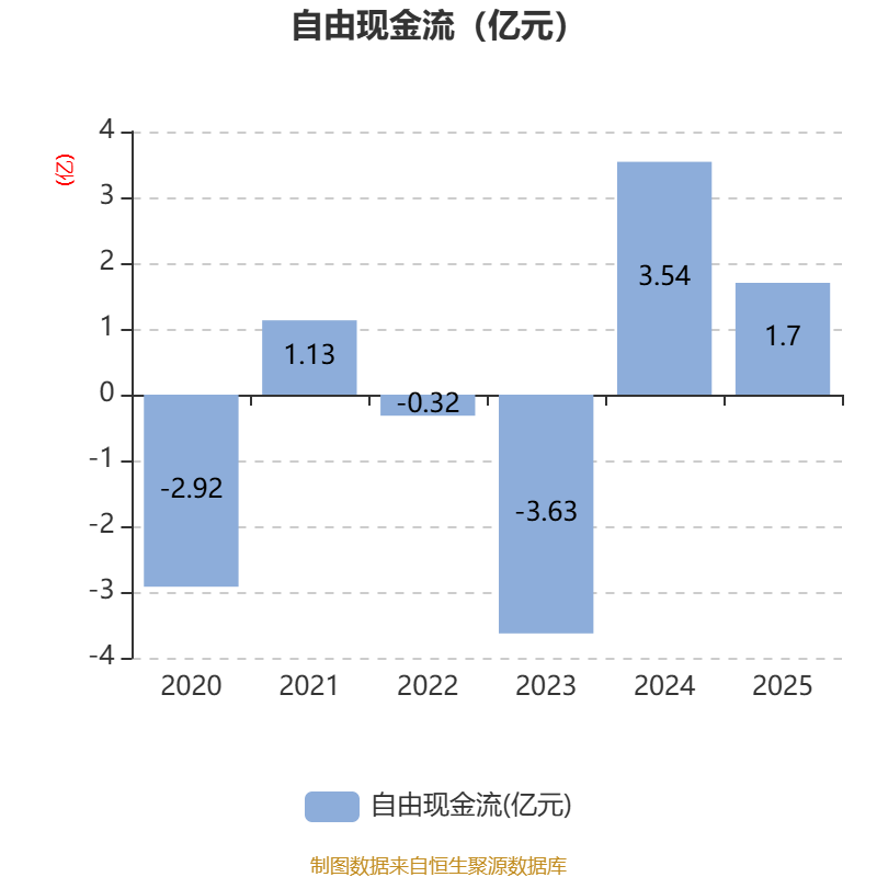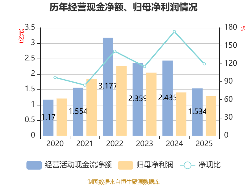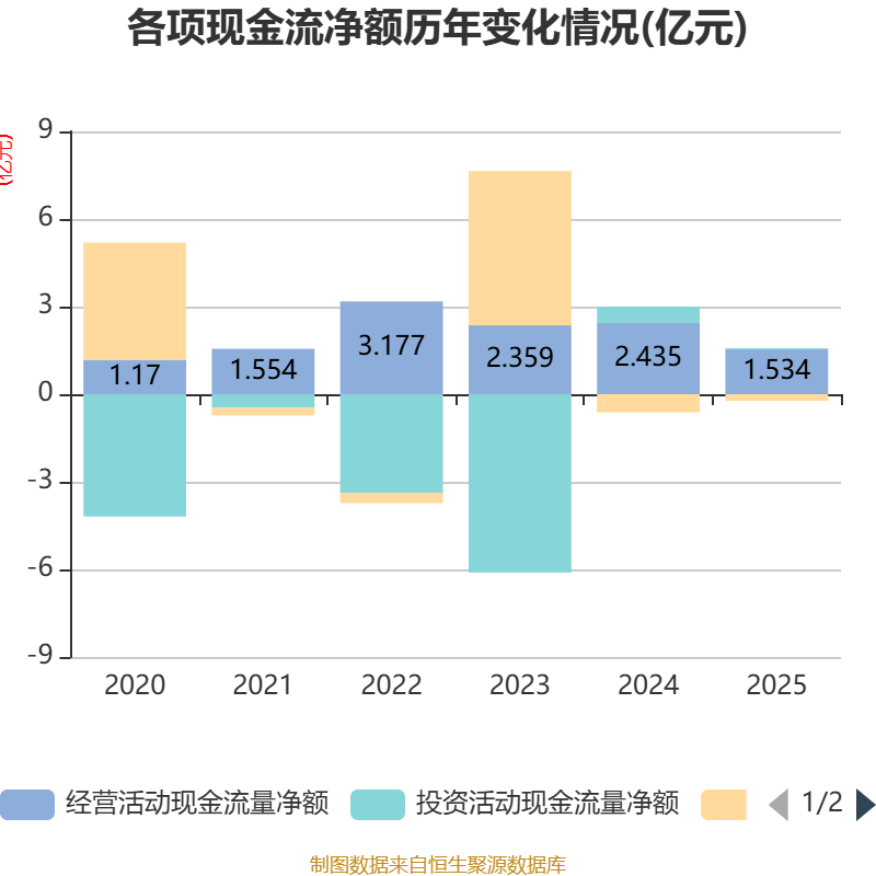截至2025年,公司经营活动现金流净额为1.53亿元,同比下降37%;筹资活动现金流净额-2280.56万元,同比增加3959.8万元;投资活动现金流净额392.09万元,上年同期为5669.75万元。