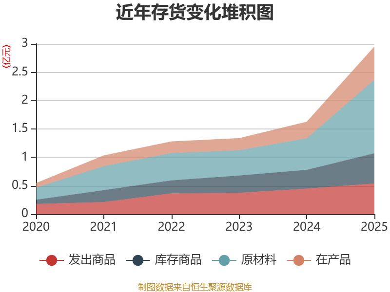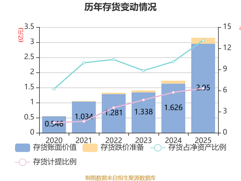 从存货变动来看,截至2025年末,公司存货账面价值为2.95亿元,占净资产的13.12%,较上年末增加1.32亿元。其中,存货跌价准备为1987.29万元,计提比例为6.31%。