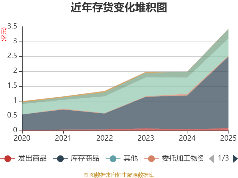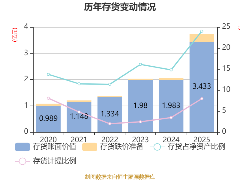 从存货变动来看,截至2025年末,公司存货账面价值为3.43亿元,占净资产的24.01%,较上年末增加1.45亿元。其中,存货跌价准备为2960.94万元,计提比例为7.94%。