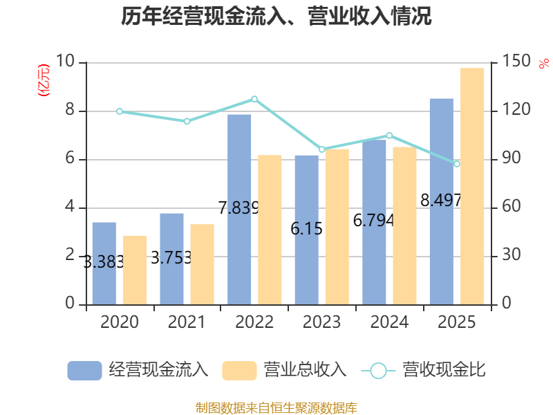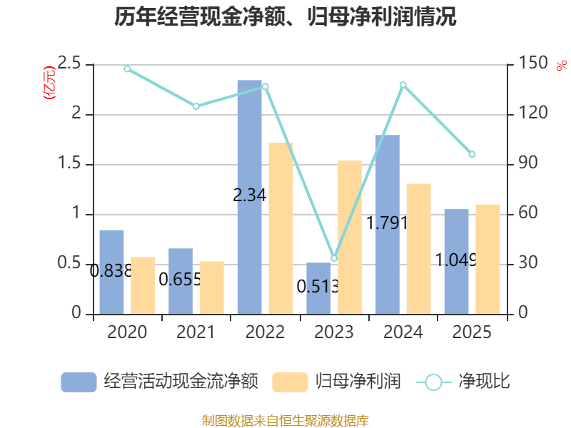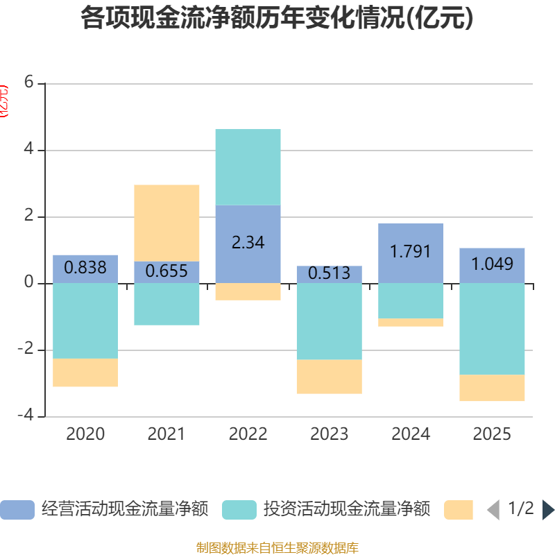 截至2025年,公司经营活动现金流净额为1.05亿元,同比下降41.41%;筹资活动现金流净额-7882.79万元,同比减少5496.94万元;投资活动现金流净额-2.76亿元,上年同期为-1.07亿元。