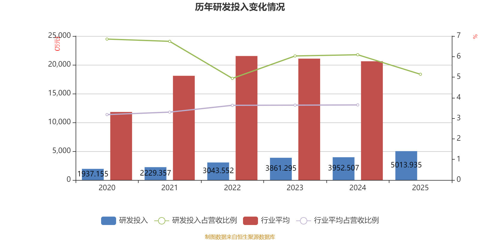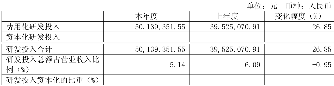 2025年全年,公司研发投入金额为5013.94万元,同比增长26.85%;研发投入占营业收入比例为5.14%,相比上年同期下降0.95个百分点。
