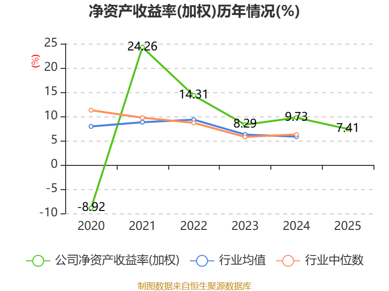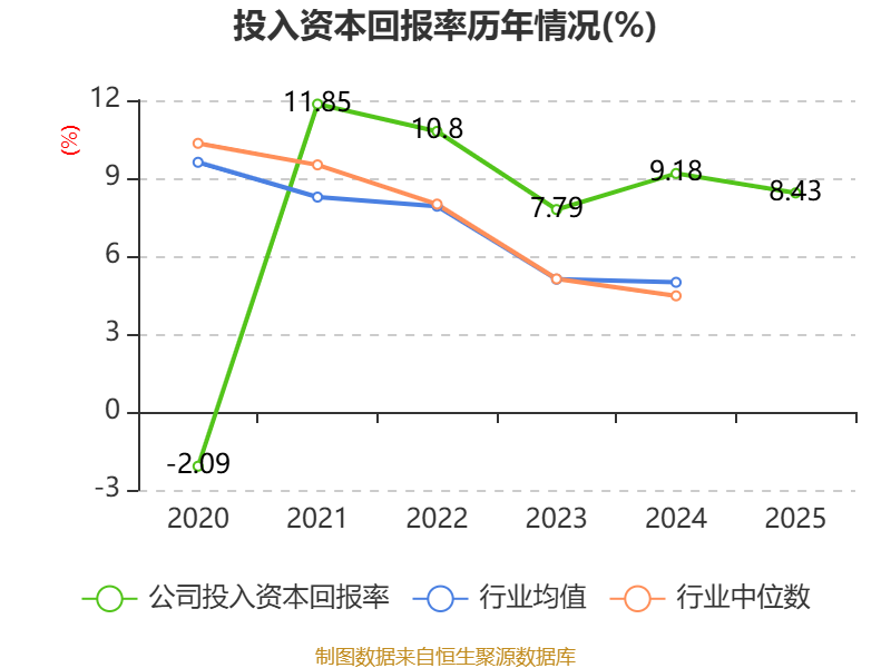 数据显示,2025年公司加权平均净资产收益率为7.41%,较上年同期下降2.32个百分点。公司2025年投入资本回报率为8.43%,较上年同期下降0.75个百分点。