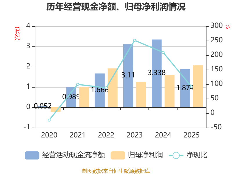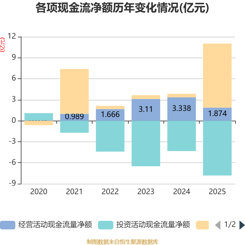 截至2025年,公司经营活动现金流净额为1.87亿元,同比下降43.86%;筹资活动现金流净额9.15亿元,同比增加8.64亿元;投资活动现金流净额-7.82亿元,上年同期为-4.33亿元。