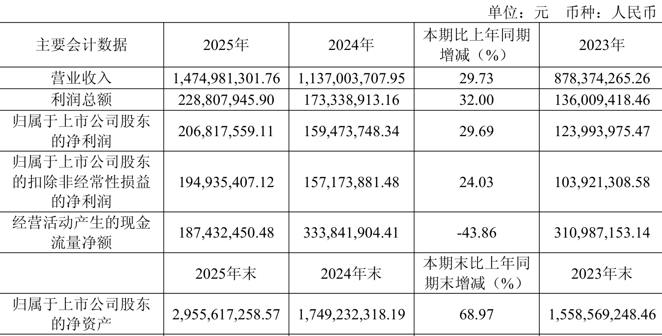 中证智能财讯兴福电子(688545)3月31日披露2025年年度报告。2025年,公司实现营业总收入14.75亿元,同比增长29.73%;归母净利润2.07亿元,同比增长29.69%;扣非净利润1.95亿元,同比增长24.03%;经营活动产生的现金流量净额为1.87亿元,同比下降43.86%;报告期内,兴福电子基本每股收益为0.59元,加权平均净资产收益率为7.41%。公司2025年度分配预案为:拟向全体股东每10股派现3元(含税)。